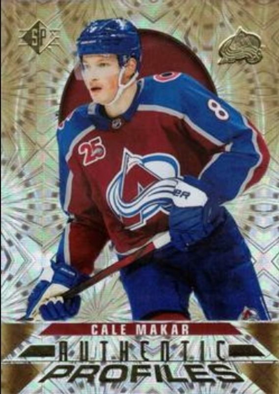 The Cale Makar 2020 SP #AP-8 Authentic Profiles - Pyrotechnic Gold card is 1 of 14 Cale Makar's card variations in the 2020 SP set being tracked by Sports Card Investor, including Base /2299, Blue, Authentic Profiles - Blue, Authentic Profiles Jersey, and Authentic Profiles Signatures.
