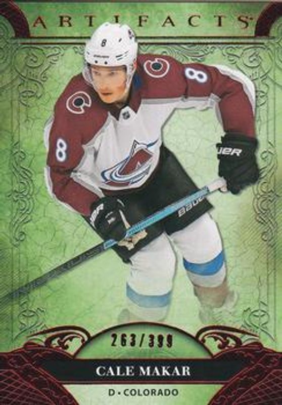 The Cale Makar 2020 Upper Deck Artifacts #116 Ruby /399 card is 1 of 29 Cale Makar's card variations in the 2020 Upper Deck Artifacts set being tracked by Sports Card Investor, including Base /999, Copper /299, Emerald /99, Autumn /75, and Aqua /45.