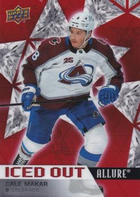 The Cale Makar 2021 Upper Deck Allure #IO-9 Iced Out card is 1 of 44 Cale Makar's card variations in the 2021 Upper Deck Allure set being tracked by Sports Card Investor, including Base, Black Rainbow, Blue China, Orange Slice die-cut, and Pink Blue Leopard.
