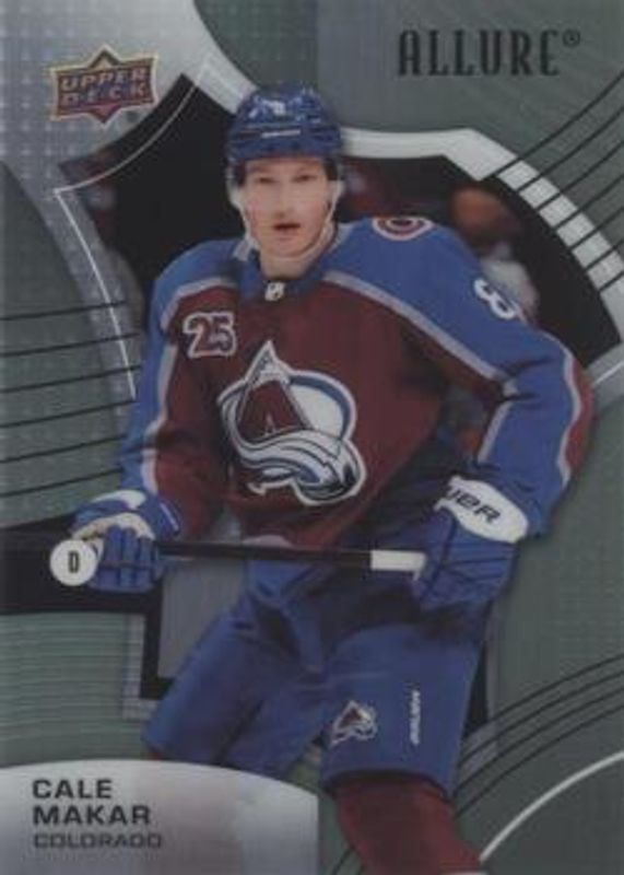 The Cale Makar 2021 Upper Deck Allure #8 Steel card is 1 of 44 Cale Makar's card variations in the 2021 Upper Deck Allure set being tracked by Sports Card Investor, including Base, Black Rainbow, Blue China, Orange Slice die-cut, and Pink Blue Leopard.