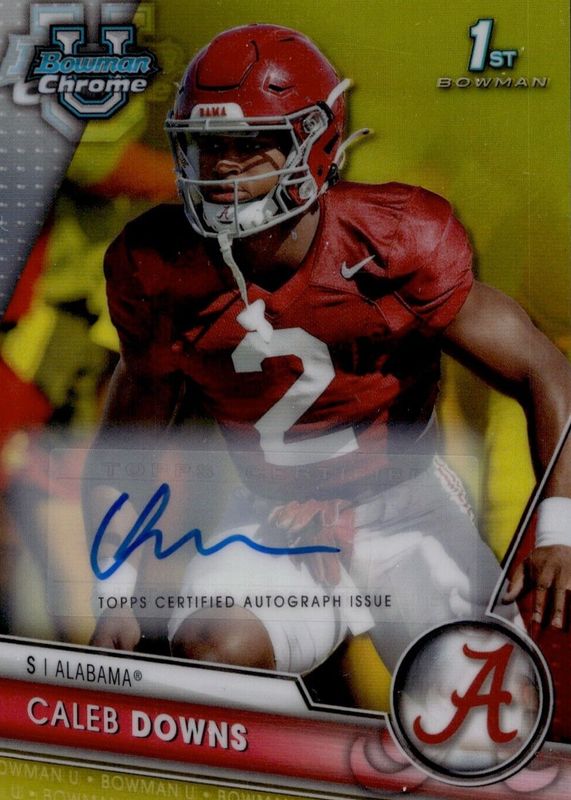 The Caleb Downs 2023 Bowman Chrome University #49 Prospect Auto - Yellow Refractor /75 (1st) card in Raw condition has not changed in price in the last 30 days and was last sold for $21.35 .