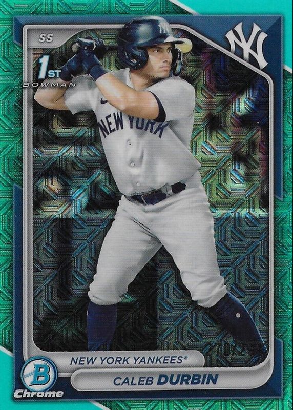 This card is 1 of 11 Caleb Durbin's card variations in the 2024 Bowman Chrome Mega Box set being tracked by Sports Card Investor, including Prospects (1st), Prospects - Purple Mojo Refractor /250 (1st), Prospects - Pink Mojo Refractor /199 (1st), Prospects - Blue Mojo Refractor /150 (1st), and Prospects - Green Mojo Refractor /99 (1st).