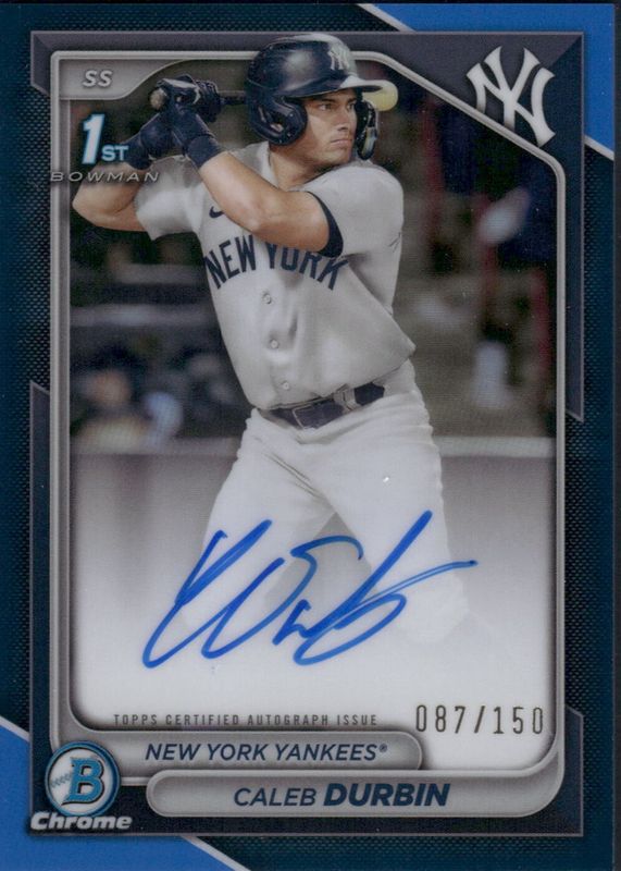 This card is 1 of 25 Caleb Durbin's card variations in the 2024 Bowman Chrome set being tracked by Sports Card Investor, including Prospect Auto (1st), Prospect Auto - Refractor /499 (1st), Prospect Auto - Speckle Refractor /299 (1st), Prospect Auto - Purple Refractor /250 (1st), and Prospect Auto - Blue RayWave Refractor /150 (1st).