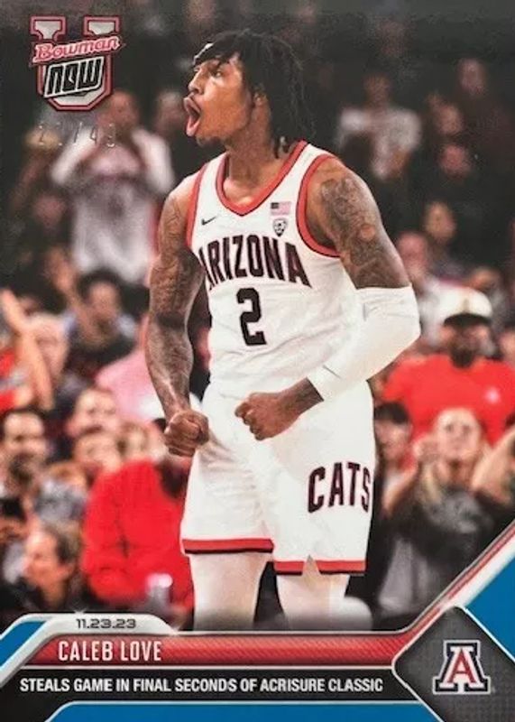 This card is 1 of 12 Caleb Love's card variations in the 2023 Bowman U Now set being tracked by Sports Card Investor, including #55 Base (Print Run: 278), #8 Base (Print Run: 154), #55 Blue /49, #55 Purple /25, and #8 Purple /25.