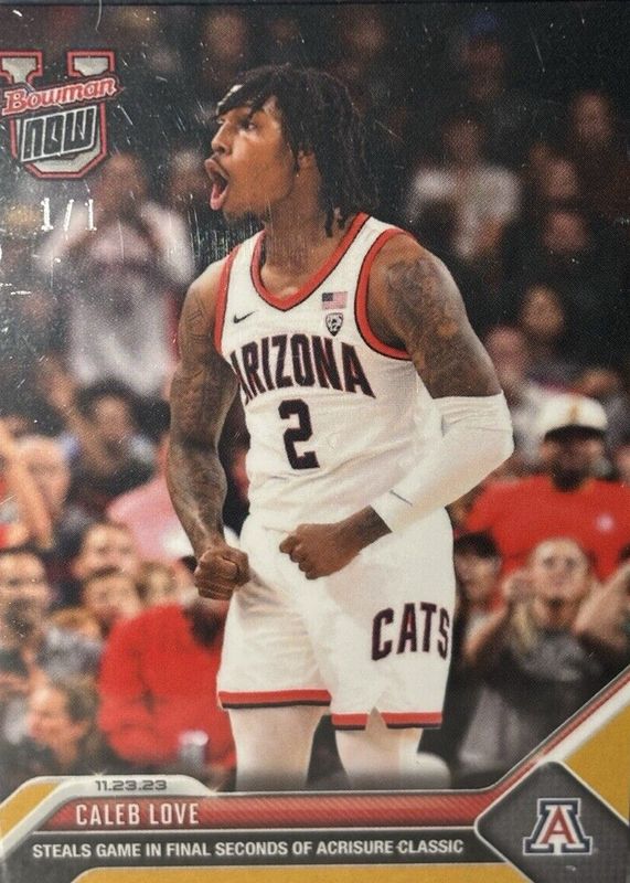 The Caleb Love 2023 Bowman U Now #8 Gold /1 card in Raw condition has not changed in price in the last 30 days and was last sold for $85.00 .