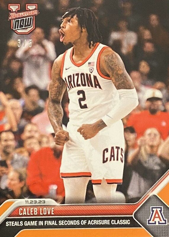 The Caleb Love 2023 Bowman U Now #8 Orange /5 card in Raw condition has not changed in price in the last 30 days and was last sold for $26.00 .
