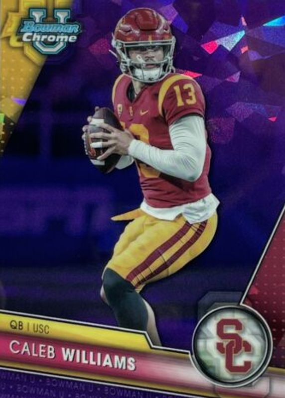 The Caleb Williams 2023 Bowman Chrome University Sapphire Edition #1 Purple /10 card in Raw condition has not changed in price in the last 30 days and was last sold for $160.00 .