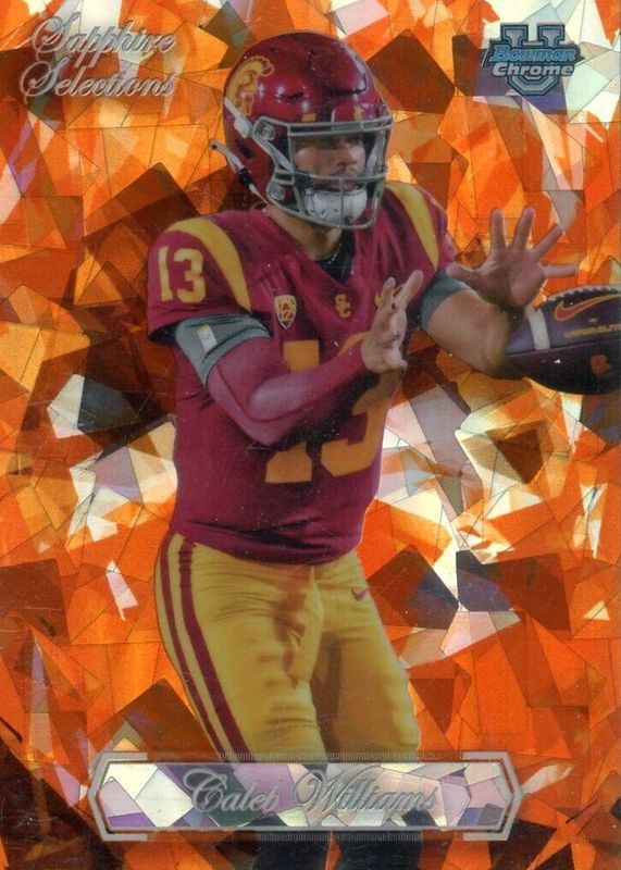 The Caleb Williams 2023 Bowman Chrome University Sapphire Edition #SS-1 Sapphire Selections - Orange /25 card in Raw condition has not changed in price in the last 30 days and was last sold for $119.99 .