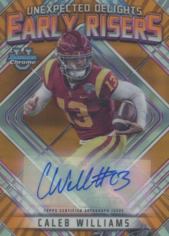 Best Prices Available For Sale of Caleb Williams 2023 Bowman Chrome University #ER-1 Unexpected Delights Early Risers Autographs - Orange Refractor /25