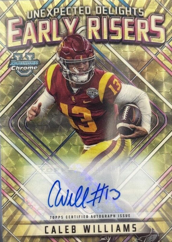 The Caleb Williams 2023 Bowman Chrome University #ER-1 Unexpected Delights Early Risers Autographs - Superfractor /1 card in Raw condition has not changed in price in the last 30 days and was last sold for $1,481.56 .