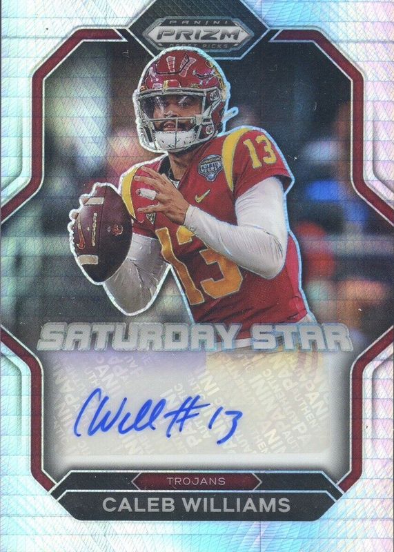 The Caleb Williams 2023 Prizm Draft Picks #SSS-CAW Saturday Star Signatures - Hyper card in Raw condition has not changed in price in the last 30 days and was last sold for $225.00 .