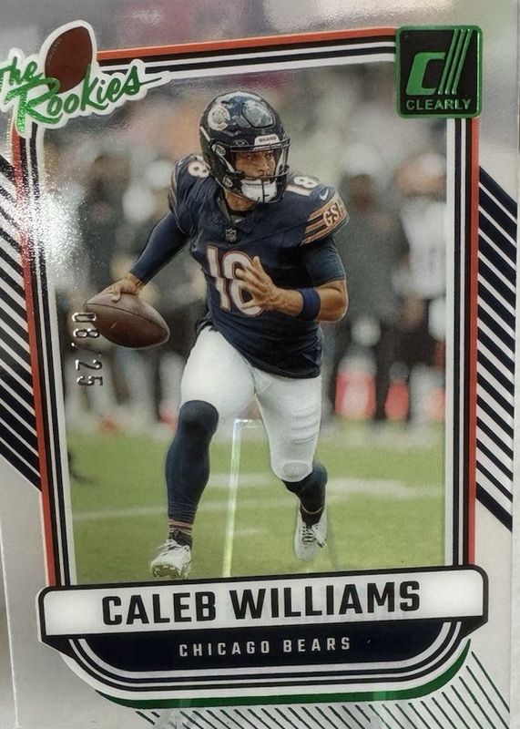 The Caleb Williams 2024 Clearly Donruss #1 Clearly The Rookies - Green /25 card in Raw condition has not changed in price in the last 30 days and was last sold for $72.00 .