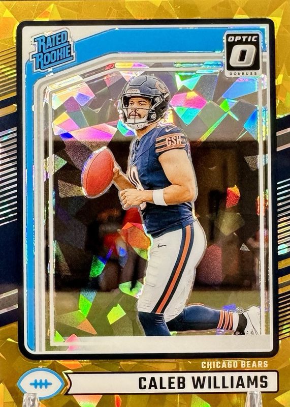 The Caleb Williams 2024 Donruss #327 Optic Preview - Gold Ice /10 Rookie card in Raw condition has not changed in price in the last 30 days and was last sold for $1,402.00 .