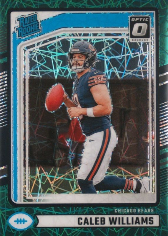 The Caleb Williams 2024 Donruss #327 Optic Preview - Green Velocity Rookie card in Raw condition has moved up $56.00 (+233%) in the last 30 days and was last sold for $80.00 .