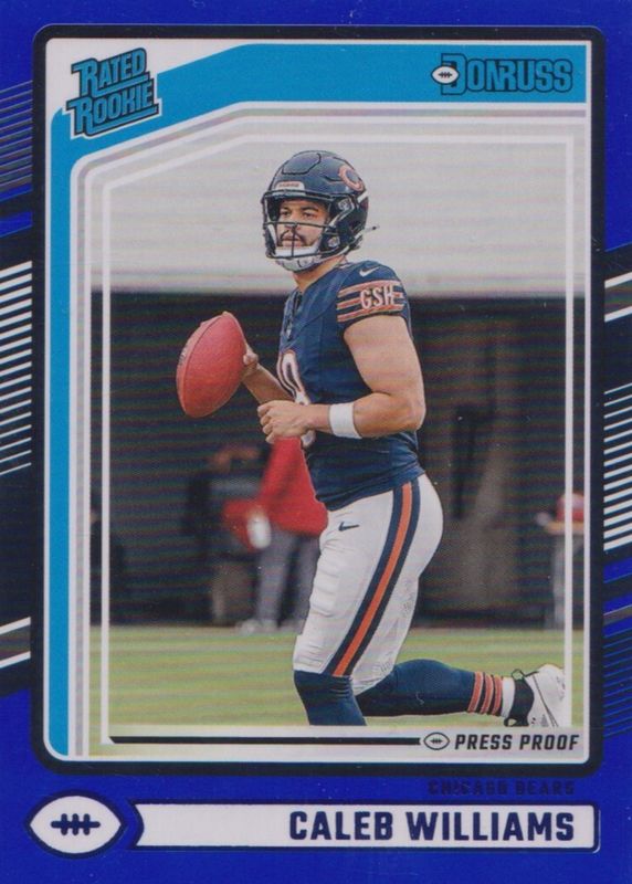 The Caleb Williams 2024 Donruss #327 Press Proof Blue Rookie card in Raw condition has moved up $0.55 (+44.0%) in the last 30 days and was last sold for $1.80 .