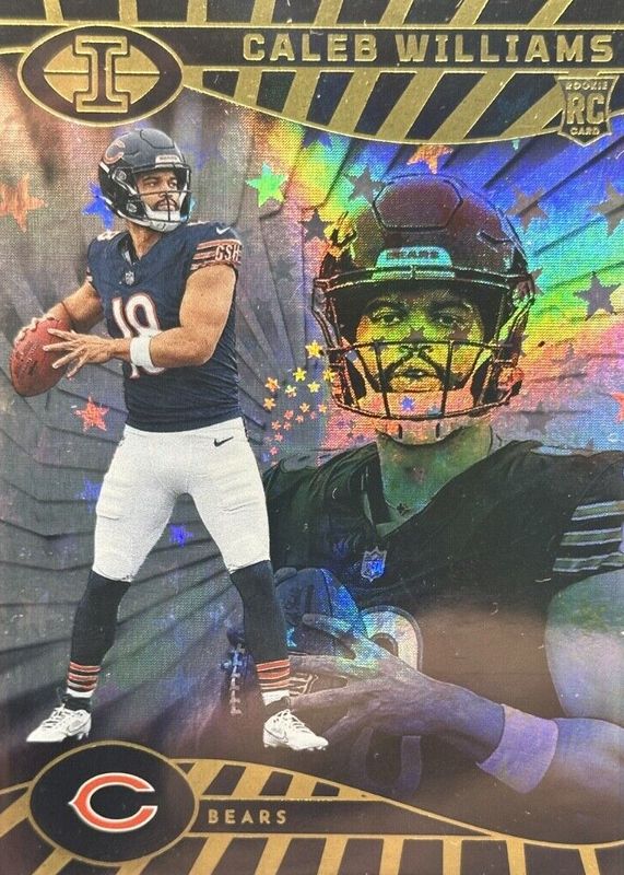 The Caleb Williams 2024 Illusions #13 Trophy Collection Galactic Rookie card in Raw condition has not changed in price in the last 30 days and was last sold for $20.00 .