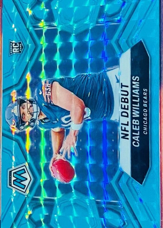 The Caleb Williams 2024 Mosaic #289 NFL Debut - Blue Fluorescent /15 Rookie card in Raw condition has not changed in price in the last 30 days and was last sold for $250.00 .