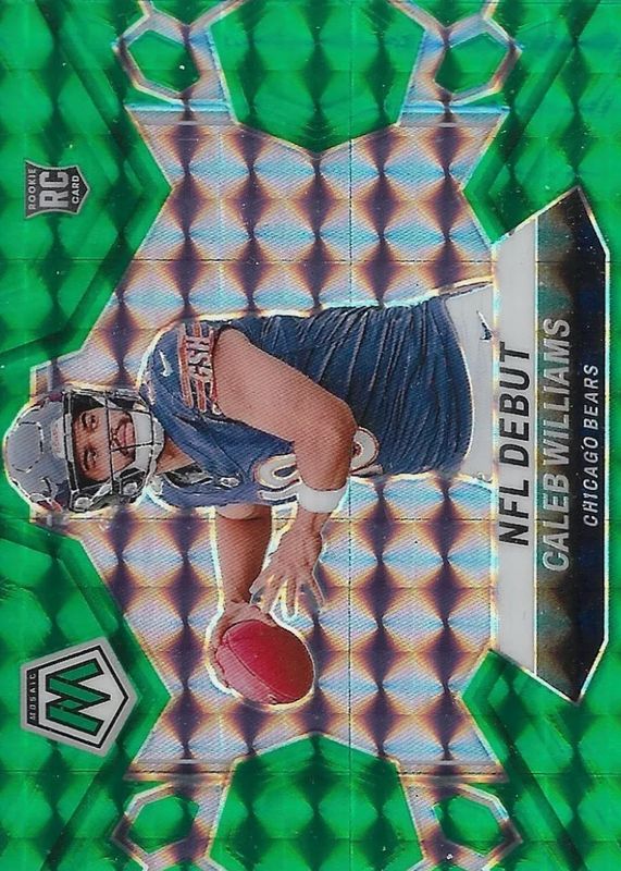 The Caleb Williams 2024 Mosaic #289 NFL Debut - Green Rookie card in Raw condition has moved down -$1.90 (-29.7%) in the last 30 days and was last sold for $4.50 .