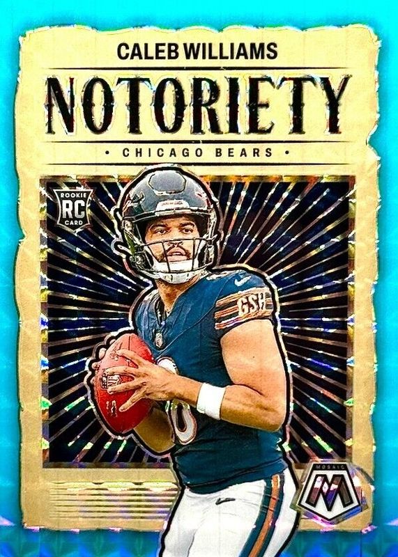 The Caleb Williams 2024 Mosaic #18 Notoriety - Blue Fluorescent /15 Rookie card in Raw condition has not changed in price in the last 30 days and was last sold for $400.00 .