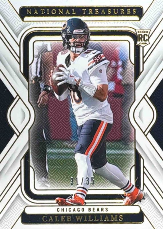 The Caleb Williams 2024 National Treasures #18 Gold /35 Rookie card in Raw condition has moved up $15.00 (+9.8%) in the last 30 days and was last sold for $167.50 .