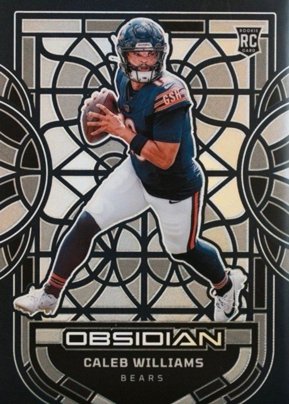 The Caleb Williams 2024 Obsidian #11 Black Stained Glass /(SSP) Rookie card in Raw condition has moved up $200 (+40.0%) in the last 30 days and was last sold for $699.99 .