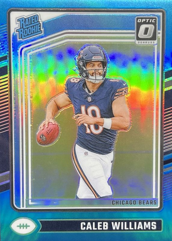 The Caleb Williams 2024 Optic #201 Aqua /299 Rookie card in Raw condition has moved up $65.73 (+65.7%) in the last 30 days and was last sold for $165.73 .