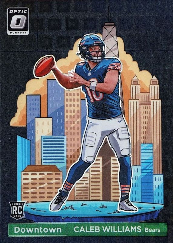 The Caleb Williams 2024 Optic #21 Downtown - Black Pandora /25 Rookie card in Raw condition has not changed in price in the last 30 days and was last sold for $3,300.00 .