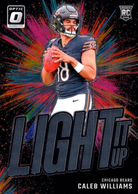 The Caleb Williams 2024 Optic #1 Light It Up Rookie card in Raw condition has moved up $3.83 (+387%) in the last 30 days and was last sold for $4.82 .