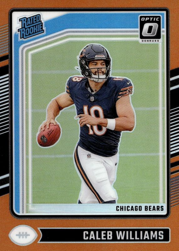 The Caleb Williams 2024 Optic #201 Orange /249 Rookie card in Raw condition has moved up $90.00 (+41.9%) in the last 30 days and was last sold for $305.00 .