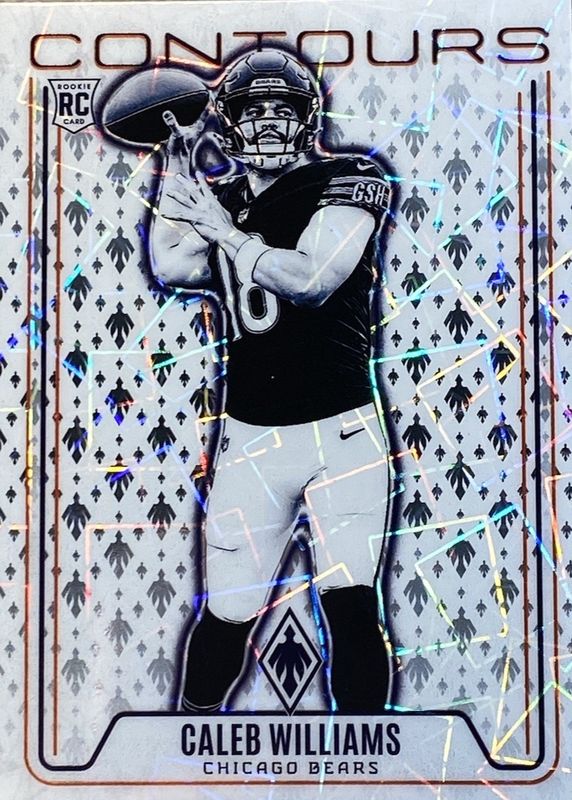 The Caleb Williams 2024 Phoenix #CON-CWS Contours - Lazer Rookie card in Raw condition has moved up $0.25 (+3.6%) in the last 30 days and was last sold for $7.25 .