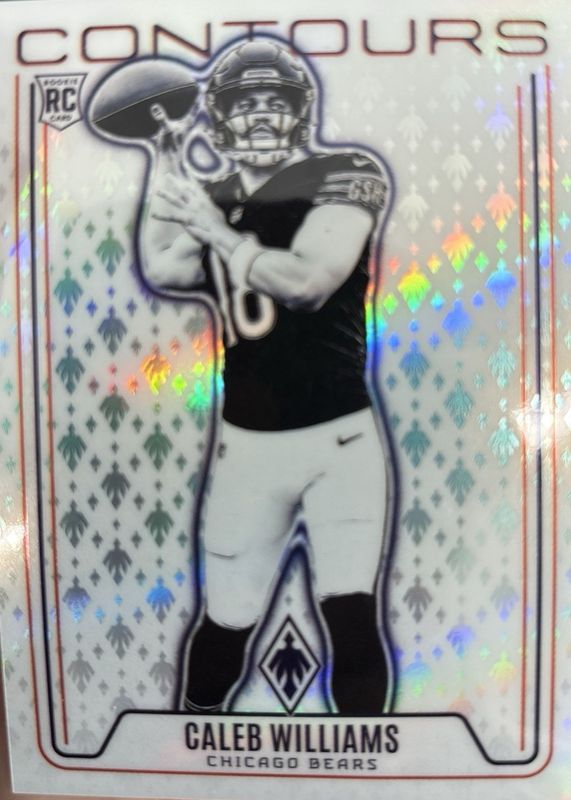 The Caleb Williams 2024 Phoenix #CON-CWS Contours - Teal /40 Rookie card in Raw condition has not changed in price in the last 30 days and was last sold for $119.95 .