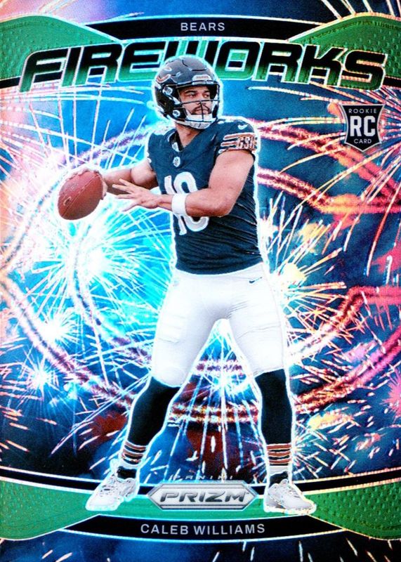 The Caleb Williams 2024 Prizm #25 Fireworks - Green Rookie card in Raw condition has moved up $0.59 (+35.5%) in the last 30 days and was last sold for $2.25 .