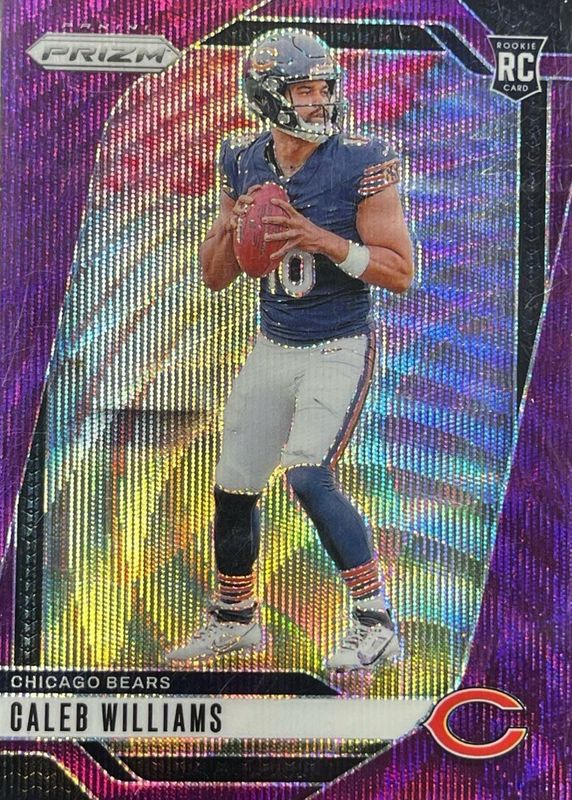 The Caleb Williams 2024 Prizm #301 Purple Wave /99 Rookie card in Raw condition has moved up $60.00 (+22.6%) in the last 30 days and was last sold for $325.00 .