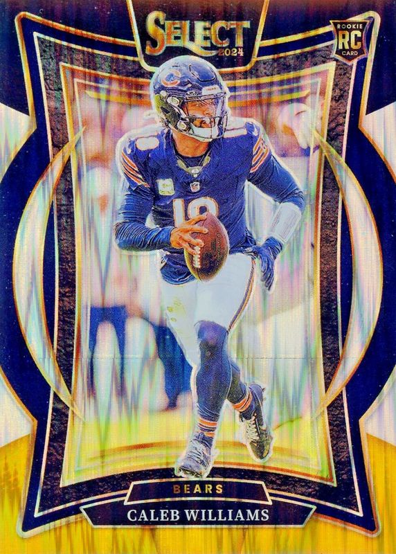 The Caleb Williams 2024 Select #25 Concourse Black & Gold Shock Rookie card in Raw condition has moved up $0.67 (+3.8%) in the last 30 days and was last sold for $18.00 .