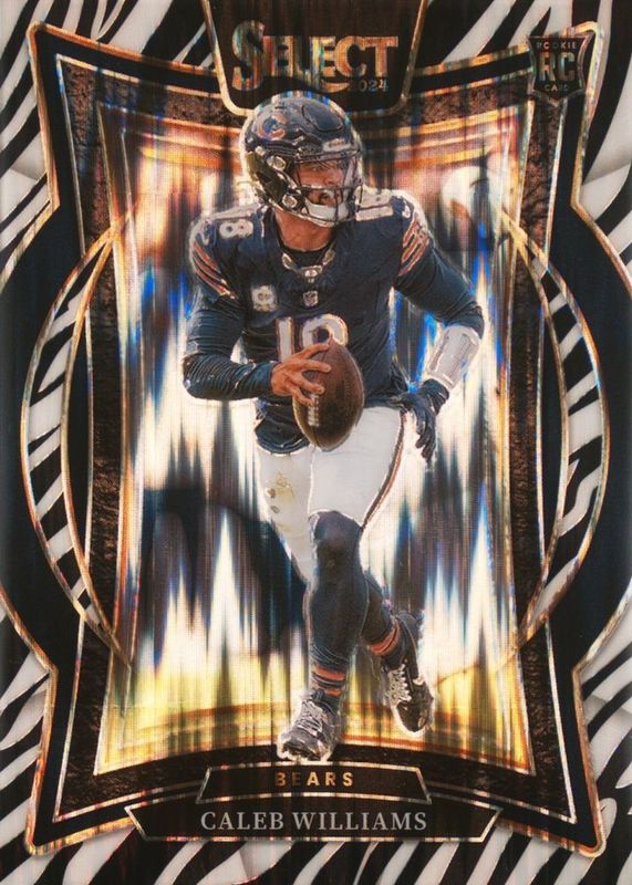 The Caleb Williams 2024 Select #25 Concourse Zebra Shock /(SSP) Rookie card in Raw condition has moved up $145 (+47.5%) in the last 30 days and was last sold for $450.00 .