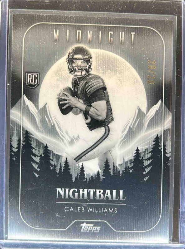 The Caleb Williams 2024 Topps Midnight #NB-5 Nightball - Equinox /20 Rookie card is 1 of 70 Caleb Williams' card variations in the 2024 Topps Midnight set being tracked by Sports Card Investor, including Base, Moon Beam, Zodiac, Morning /149, and Twilight /99.