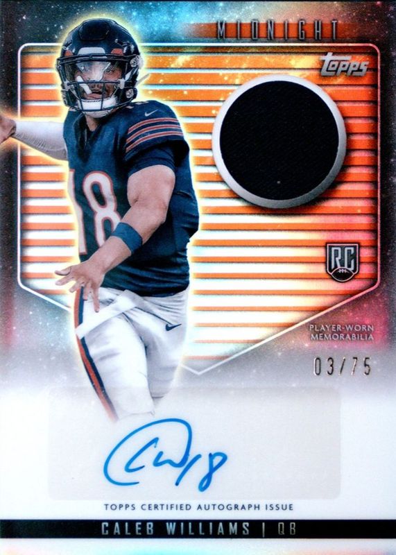 The Caleb Williams 2024 Topps Midnight #RJA-CW Rookie Jersey Autographs - Dusk /75 card in Raw condition has not changed in price in the last 30 days and was last sold for $275.00 .