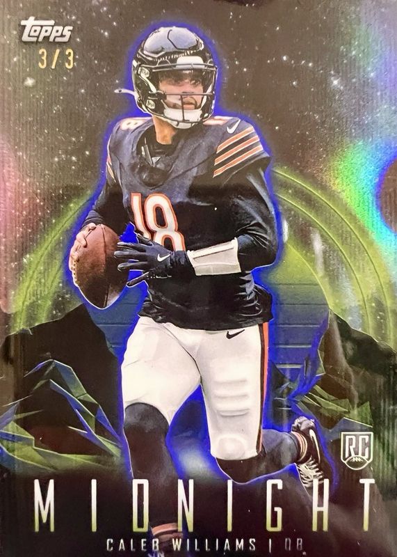 The Caleb Williams 2024 Topps Midnight #1 Witching Hour /3 Rookie card in Raw condition has not changed in price in the last 30 days and was last sold for $153.50 .