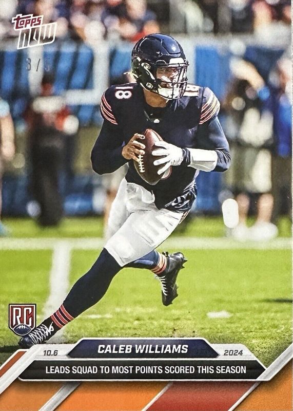 This card is 1 of 24 Caleb Williams' card variations in the 2024 Topps Now set being tracked by Sports Card Investor, including Base (Print Run: 3,662), Base (Print Run: 28,262), Base (Print Run: 4,728), Base (Print Run: 6,573), and Blue /49.