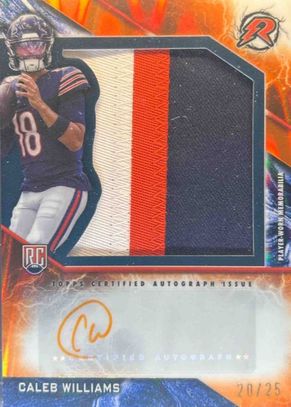 Auctions Ending Soon for Caleb Williams 2024 Topps Resurgence #RPA-CW Resurgence Rookie Patch Autographs - Orange Power Surge Refractor /25 RAW