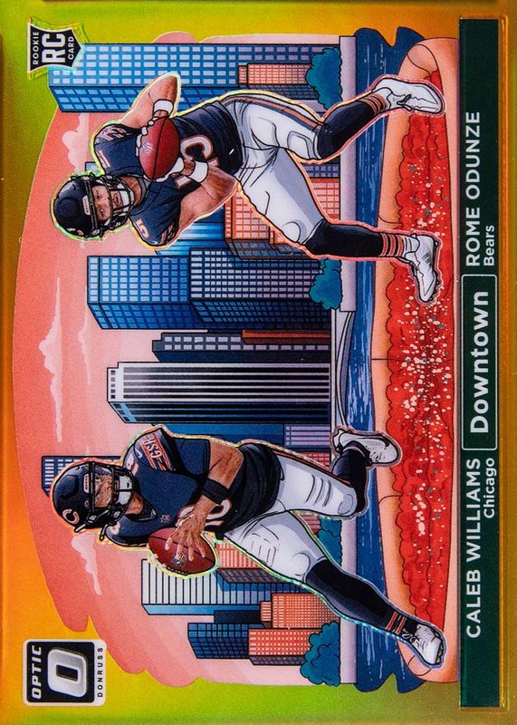 This card is 1 of 5 Caleb Williams / Rome Odunze's card variations in the 2024 Optic set being tracked by Sports Card Investor, including Downtown Duos /(SSP), Downtown Duos - Black Pandora /25, Downtown Duos - Gold Vinyl /1, and Downtown Duos - White Sparkle /1.