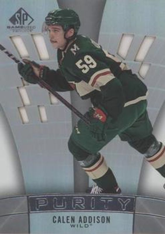 The Calen Addison 2021 SP Game Used #P-79 Purity Rookie card is 1 of 26 Calen Addison's card variations in the 2021 SP Game Used set being tracked by Sports Card Investor, including Base /99, Blue Auto, Red Jersey, Red Fragment /205, and Gold Auto Jersey /99.