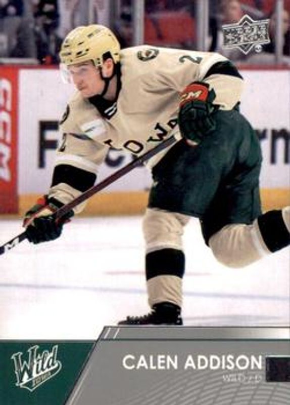 The Calen Addison 2021 Upper Deck AHL #8 Base Rookie card is 1 of 14 Calen Addison's card variations in the 2021 Upper Deck AHL set being tracked by Sports Card Investor, including Exclusives /100, High Gloss /10, AHL All Rookie Team, AHL All Rookie Team - Red, and AHL All Stars.