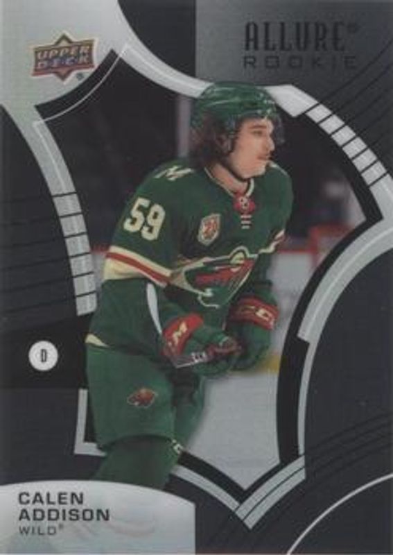 The Calen Addison 2021 Upper Deck Allure #133 Black Rainbow Rookie card is 1 of 45 Calen Addison's card variations in the 2021 Upper Deck Allure set being tracked by Sports Card Investor, including Base, 1917 Shield, 2005 Shield, Blue China, and Leopard.