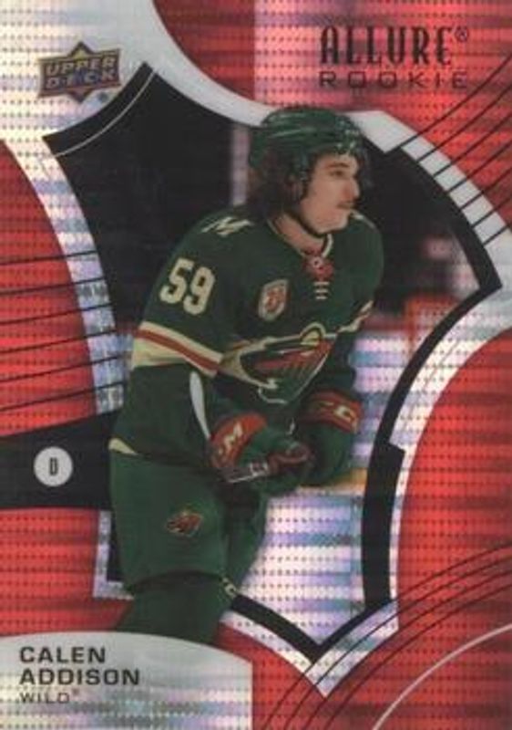 The Calen Addison 2021 Upper Deck Allure #133 Red Rainbow Rookie card is 1 of 45 Calen Addison's card variations in the 2021 Upper Deck Allure set being tracked by Sports Card Investor, including Base, 1917 Shield, 2005 Shield, Black Rainbow, and Blue China.