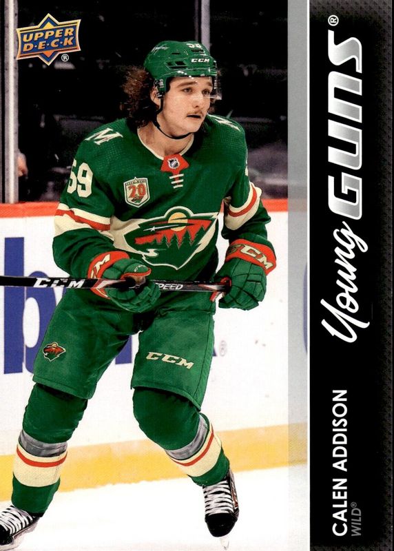 This card is 1 of 9 Calen Addison's card variations in the 2021 Upper Deck set being tracked by Sports Card Investor, including Young Guns Base, Young Guns - Clear Cut, Young Guns - Clear Cut Exclusives, Young Guns - French, and Young Guns - Silver Foil.