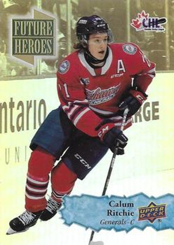 The Calum Ritchie 2022 Upper Deck CHL #FH-7 Future Heroes card is 1 of 16 Calum Ritchie's card variations in the 2022 Upper Deck CHL set being tracked by Sports Card Investor, including Base, Clear Cut, Red, Exclusives /100, and High Gloss /10.
