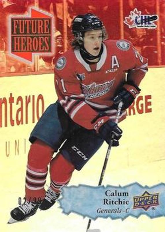 The Calum Ritchie 2022 Upper Deck CHL #FH-7 Future Heroes - Red /99 card is 1 of 16 Calum Ritchie's card variations in the 2022 Upper Deck CHL set being tracked by Sports Card Investor, including Base, Clear Cut, Red, Exclusives /100, and High Gloss /10.