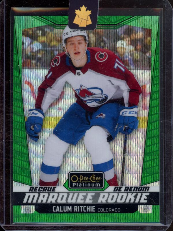 The Calum Ritchie 2024 O-Pee-Chee Platinum #274 Emerald Surge /10 Rookie card is 1 of 15 Calum Ritchie's card variations in the 2024 O-Pee-Chee Platinum set being tracked by Sports Card Investor, including Base, Neon Yellow Surge, Pink Magma, Rainbow, and Sunset.