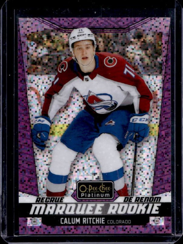 The Calum Ritchie 2024 O-Pee-Chee Platinum #274 Violet Pixels /299 Rookie card is 1 of 15 Calum Ritchie's card variations in the 2024 O-Pee-Chee Platinum set being tracked by Sports Card Investor, including Base, Neon Yellow Surge, Pink Magma, Rainbow, and Sunset.